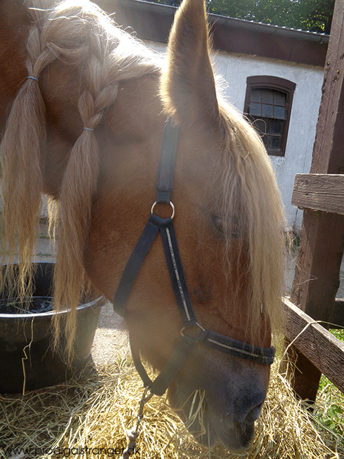 I like to sit next to Emilie as she chews her hay and watch her. There is so much going on in those dark brown and blue eyes. Her long lashes are two-coloured — red in the inner end of the eye and white in the other, a gradual change of colour.